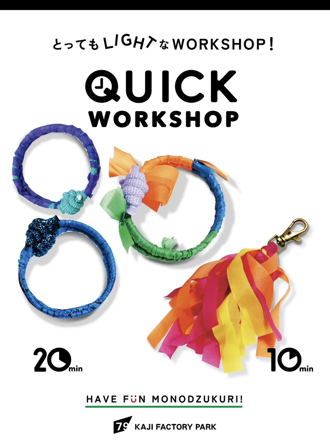 ゴム紐とKAJI GROUPの生地を使い、カラーや長さを自由に選んで、オリジナルのスマホストラップを作りましょう。短めに作れば、キーホルダーストラップとしても楽しめます。完成後は、ストラップホルダーと一緒にお渡しします。(製作時間に個人差があります。予約の際はご注意ください。)