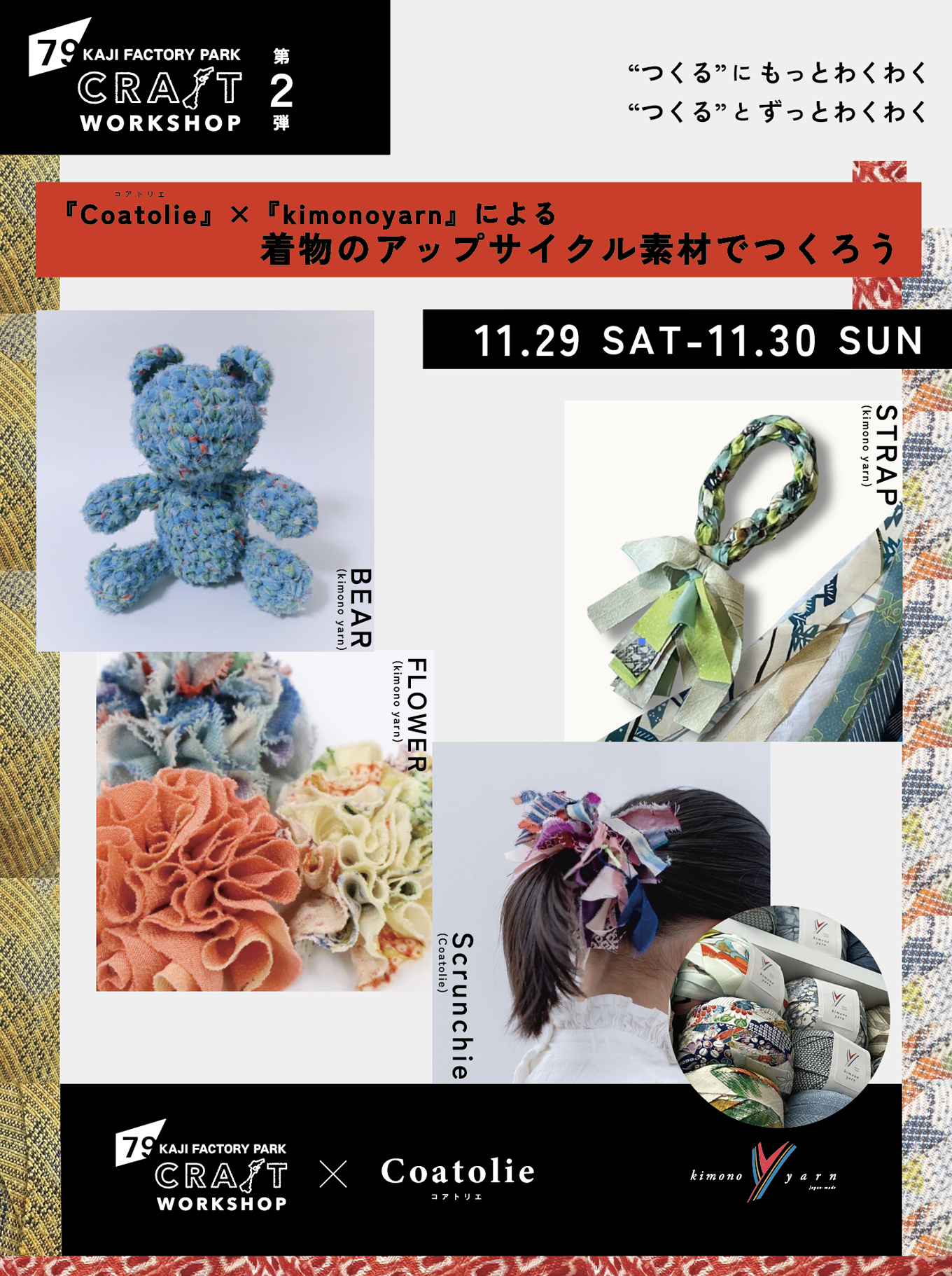 着物アップサイクル素材で作ろう!【メニュー】BEAR¥5,000・STRAP(ショート)¥1,650(ロング)¥2,200・FLOWER¥1,100・SCRUNCHIE¥1,100【開催時間】11:00~17:00(空きあれば随時参加可能)【対象】どなたでも